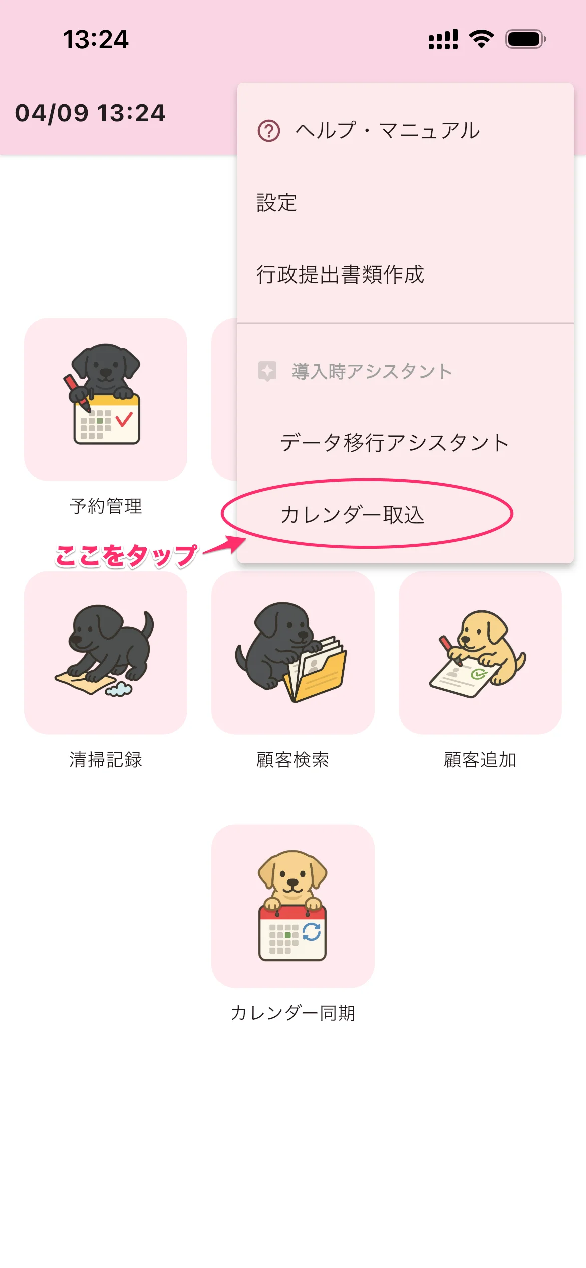 GoogleカレンダーやiPhoneのカレンダーアプリに入力してある予約情報を、はるぷぴに取り込む機能です。AIがペットホテル・トリミングサロンなどに関係する予約イベントを自動で判断し、「仮予約」として登録します。