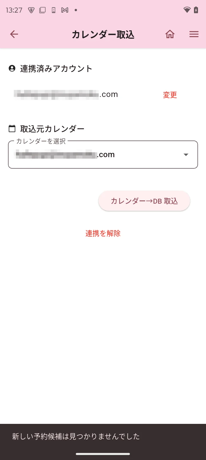 | 新しい予約候補は見つかりませんでした | すでに取込済みか、対象期間にペット関連のイベントがありません |