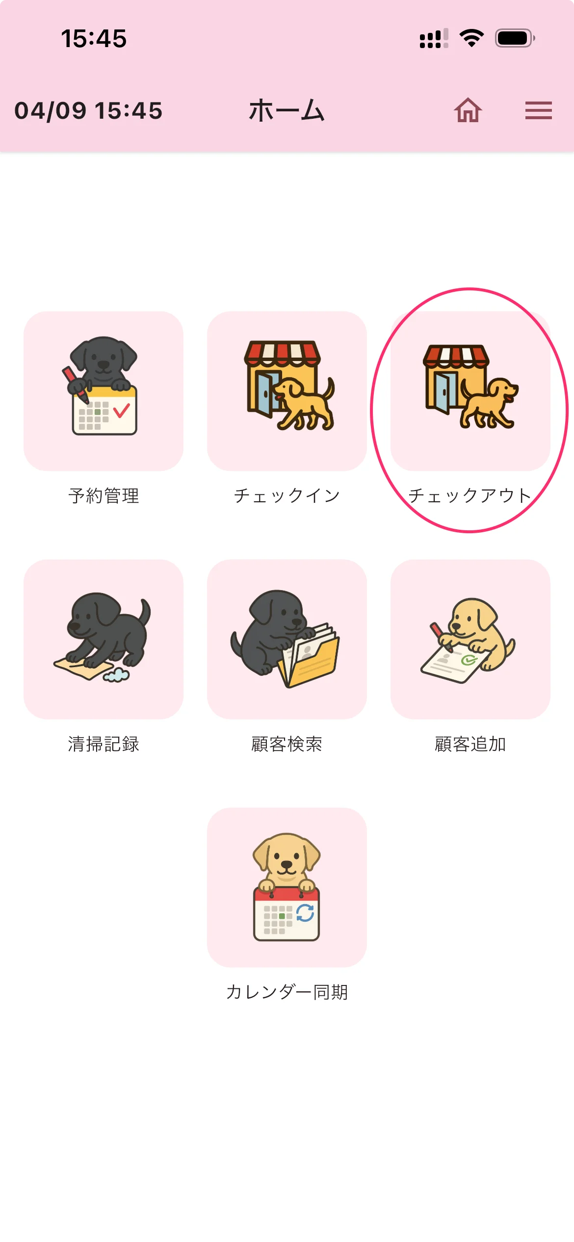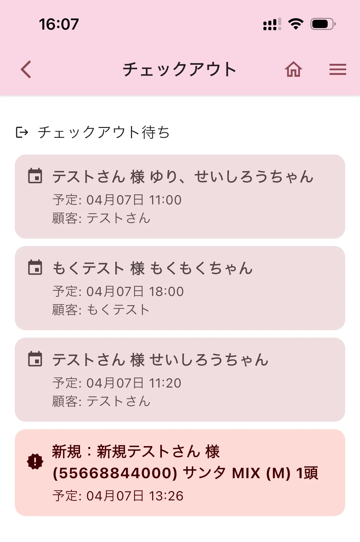 ホーム画面の「チェックアウト」をタップするとチェックアウト待ち一覧が表示されます。