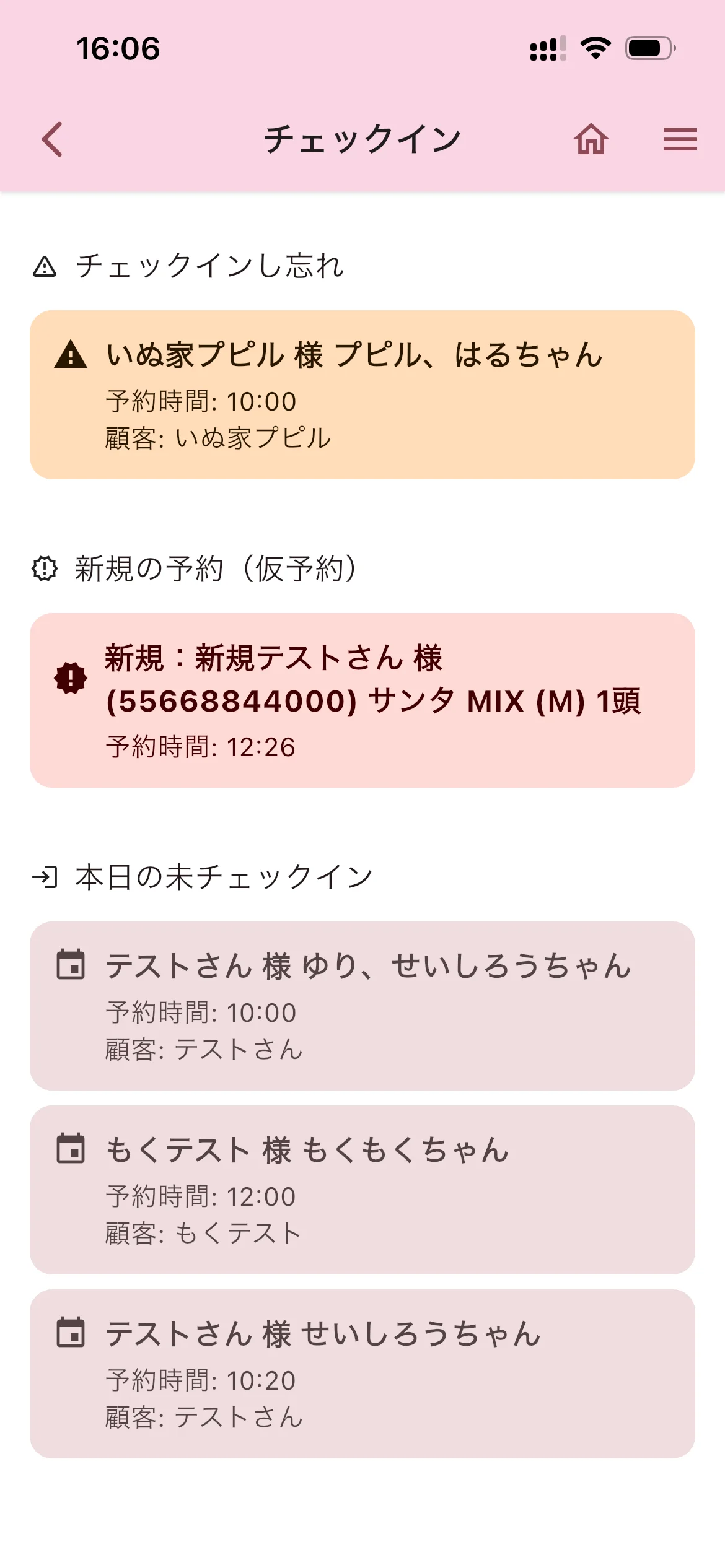 - ⚠️ チェックインし忘れ:前日以前の予約でチェックインが完了していないもの(オレンジ色で表示)
