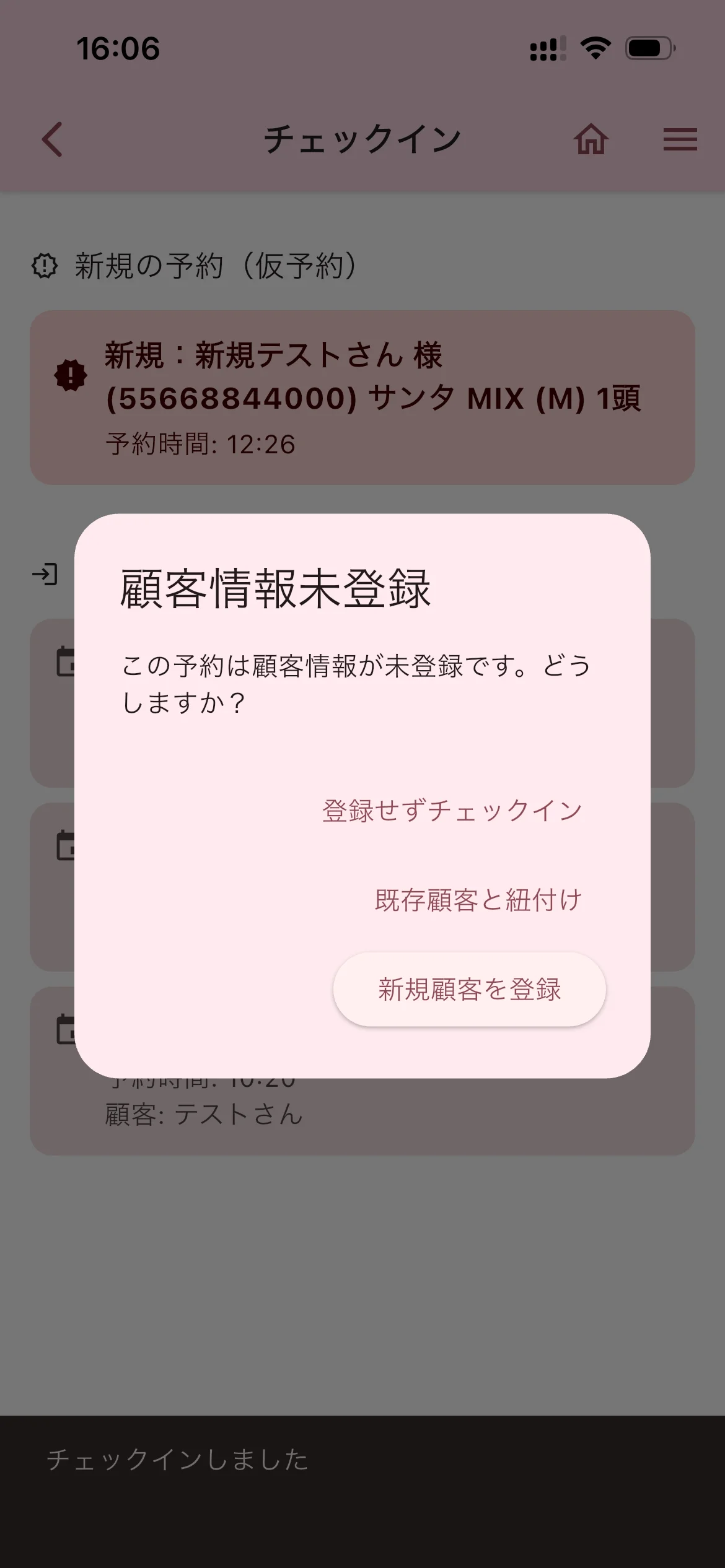 「新規の予約(仮予約)」のカードをタップすると「顧客情報未登録」ダイアログが表示されます。