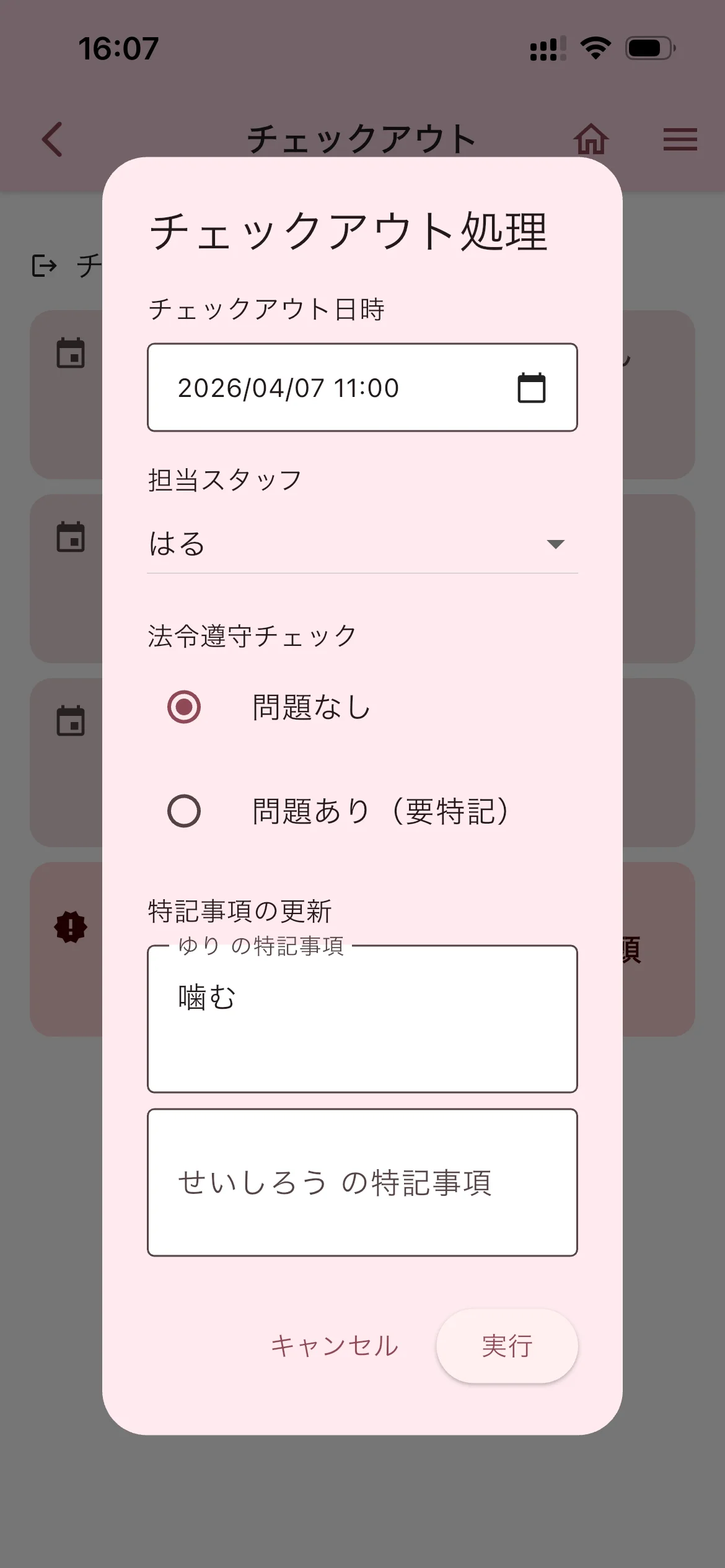 - 特記事項の更新:お預かり中に気になったことがあれば各ペットの欄に入力してください(次回以降のお預かりに引き継がれます)