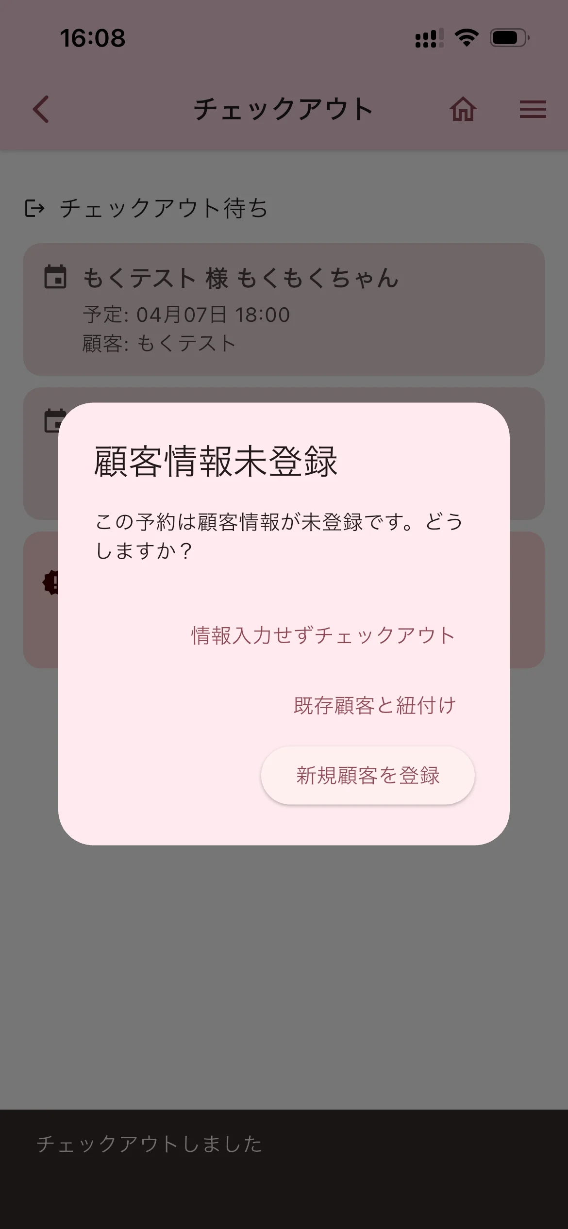 顧客情報が未登録の仮予約カードをタップすると「顧客情報未登録」ダイアログが表示されます。