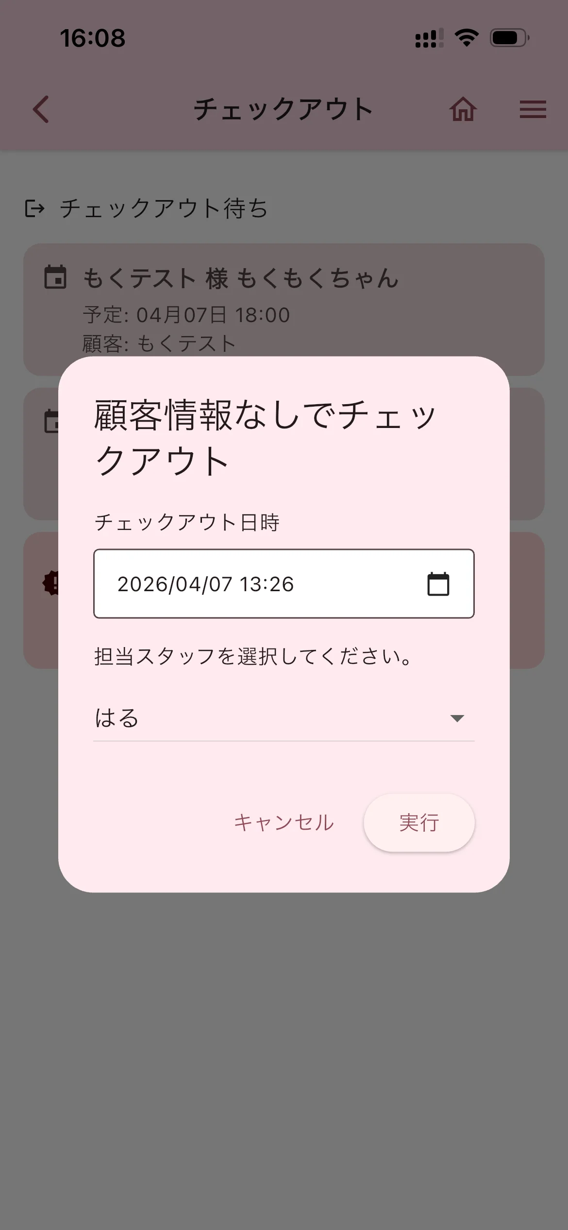 チェックアウト待ちのカードをタップすると「チェックアウト処理」ダイアログが表示されます。