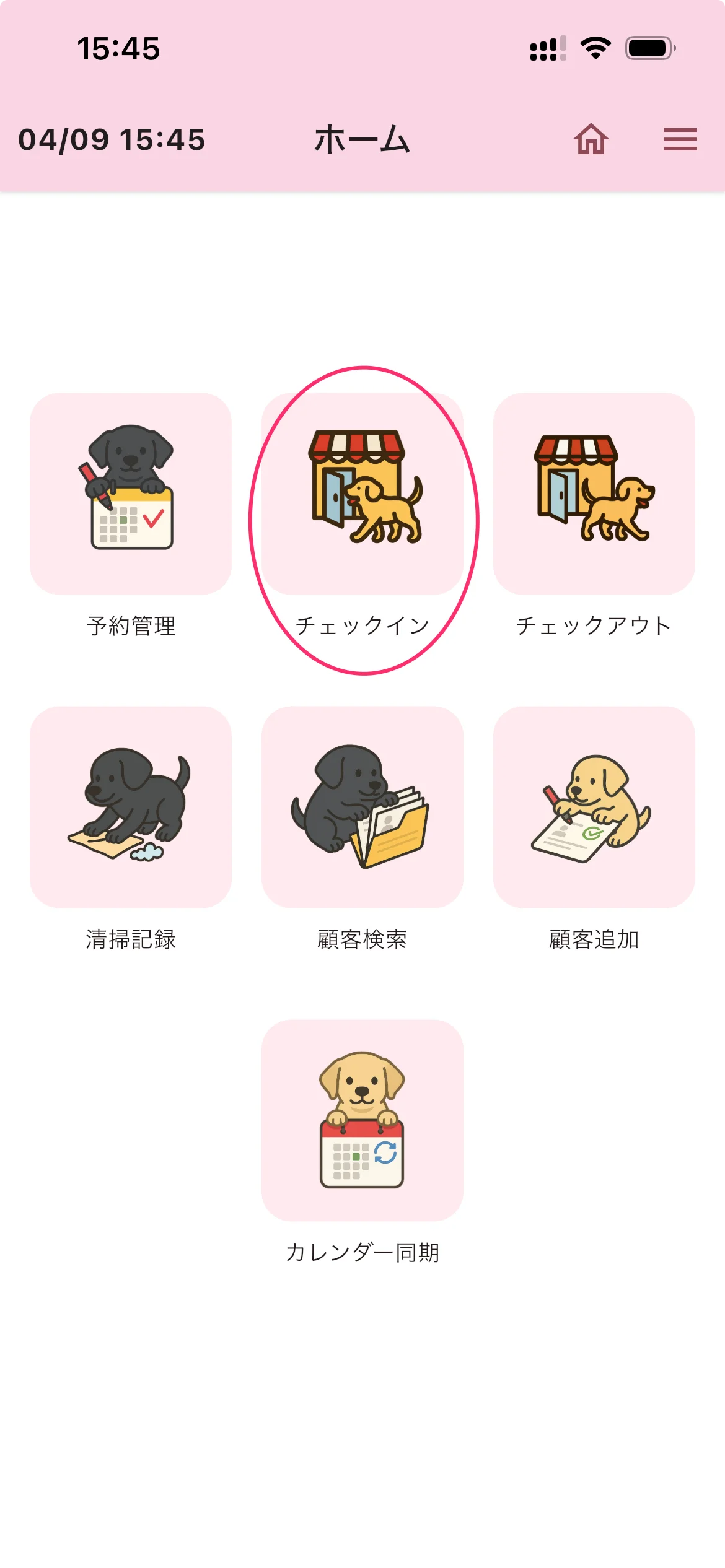 ホーム画面の「チェックイン」をタップするとチェックイン画面が表示されます。