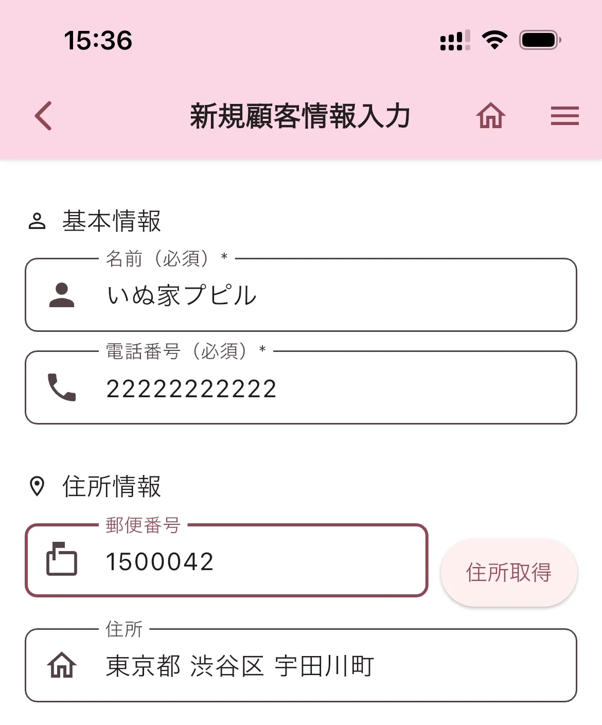 郵便番号を入力して「住所取得」をタップすると、住所が自動で入力されます。