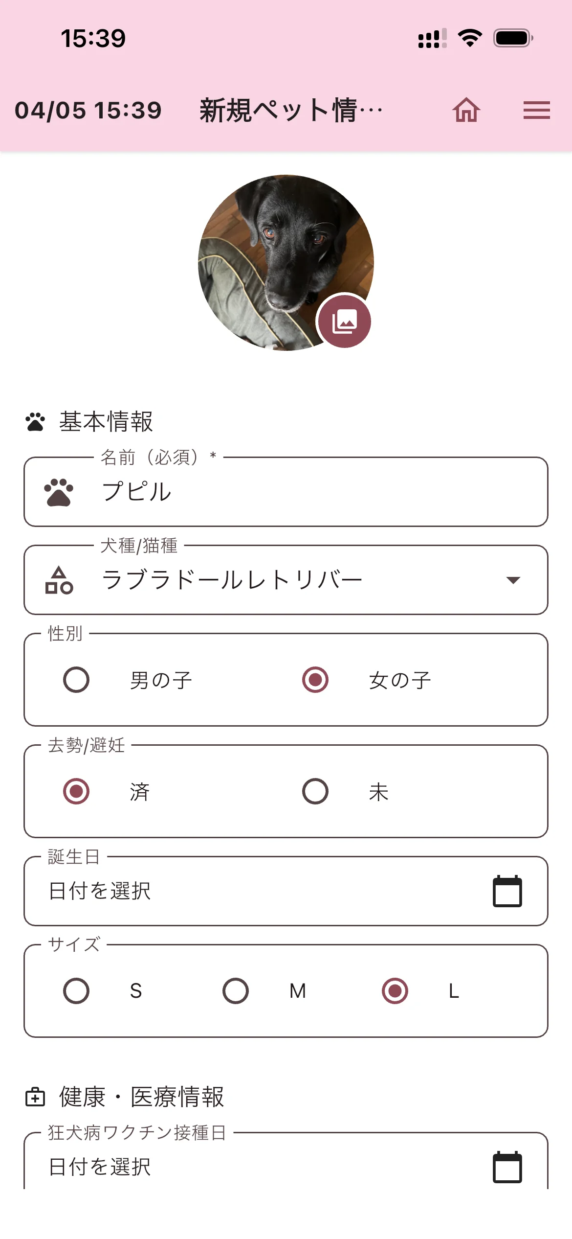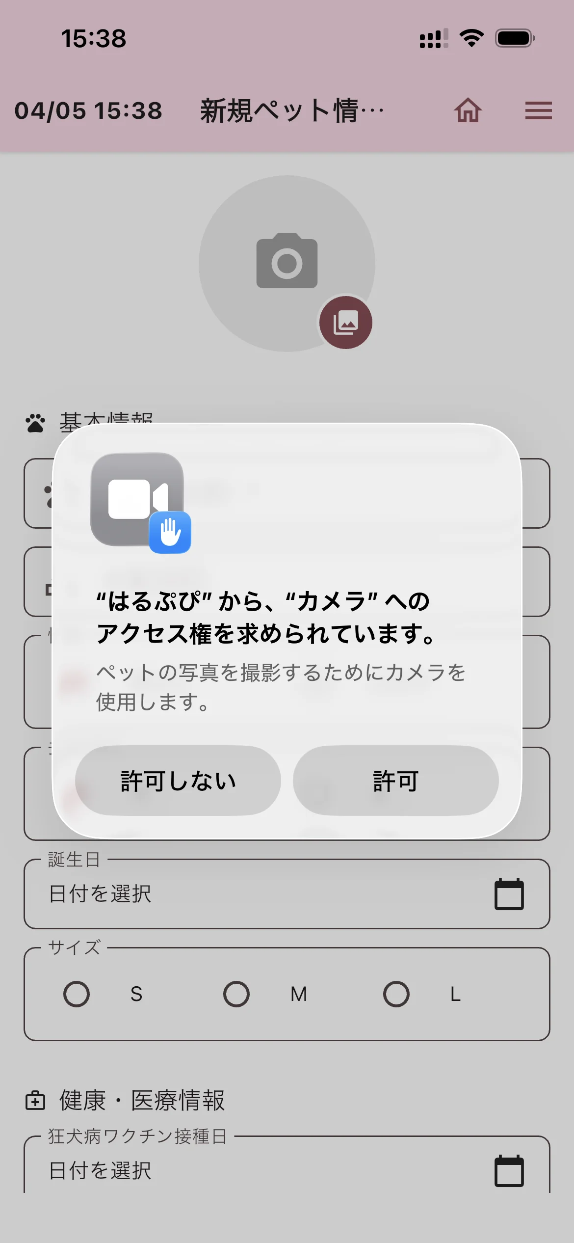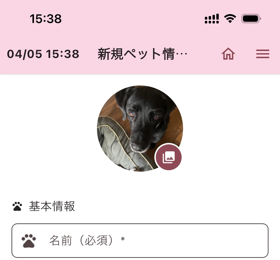 ペット情報入力画面が表示されます。画面上部の丸いアイコンをタップするとカメラまたはフォトライブラリからペットの写真を登録できます。