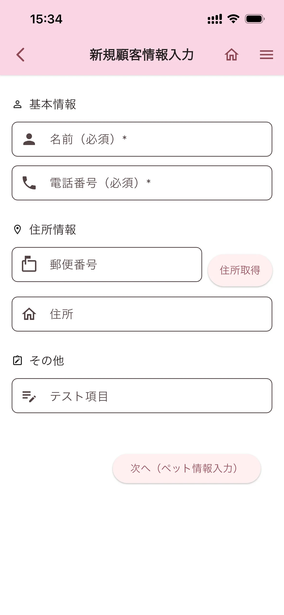 ホーム画面の「顧客追加」をタップすると、新規顧客情報入力画面が表示されます。
