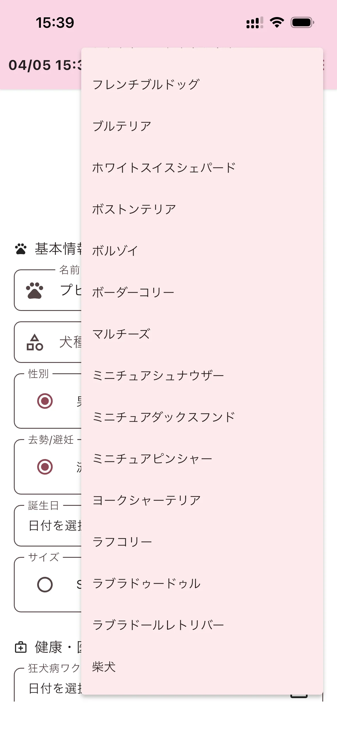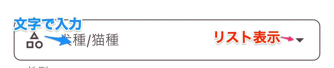 - 犬種/猫種:タップするとリストが表示されます。該当する犬種・猫種を選んでタップしてください