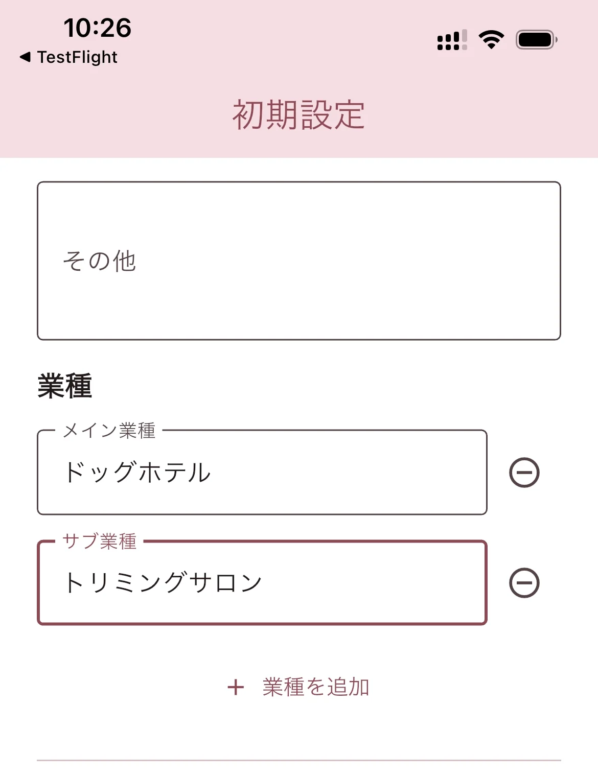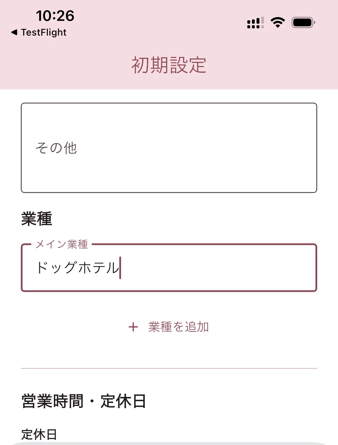 メイン業種(例:ドッグホテル)を入力します。トリミングサロンなど複数の業種がある場合は「+業種を追加」をタップしてサブ業種を追加できます。
