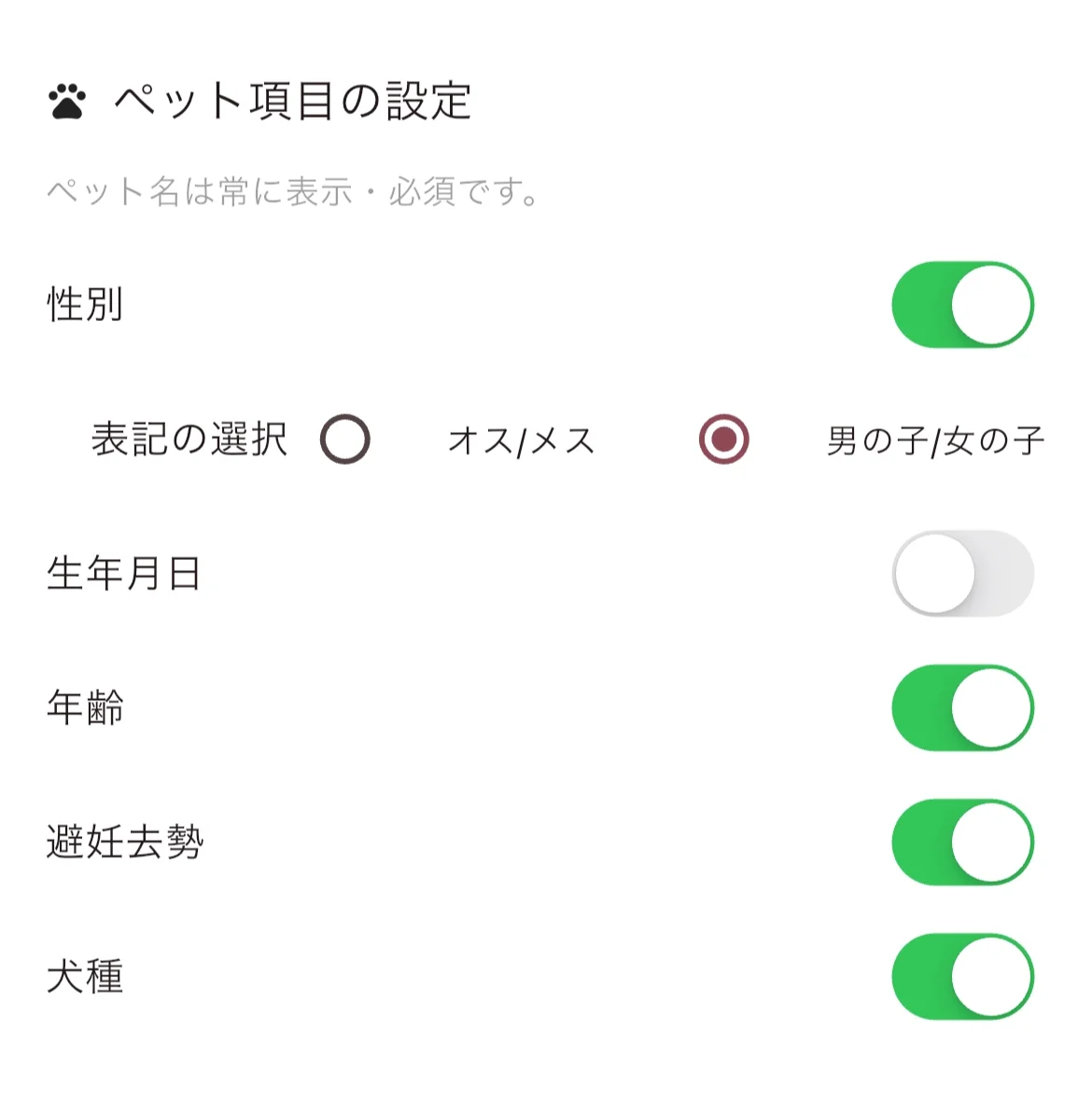 - 性別の表記は「オス/メス」または「男の子/女の子」から選べます