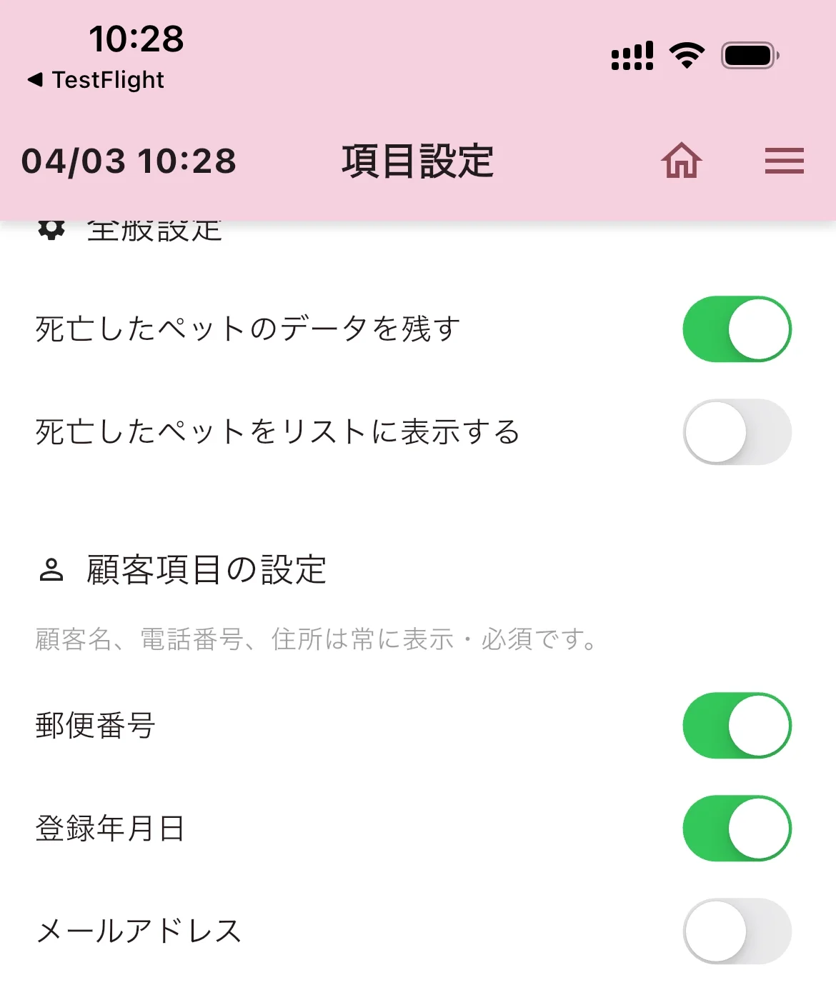 顧客情報・ペット情報として管理したい項目をON/OFFで設定します。