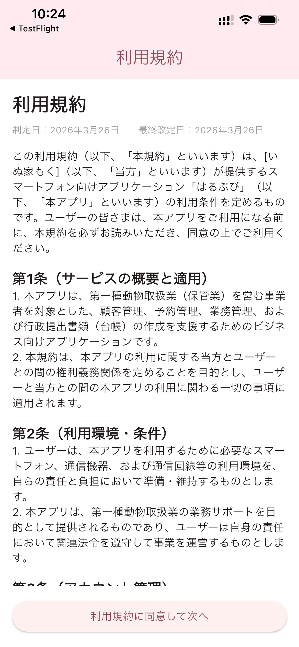 利用規約が表示されます。内容をスクロールして最後まで確認し、「利用規約に同意して次へ」をタップしてください。