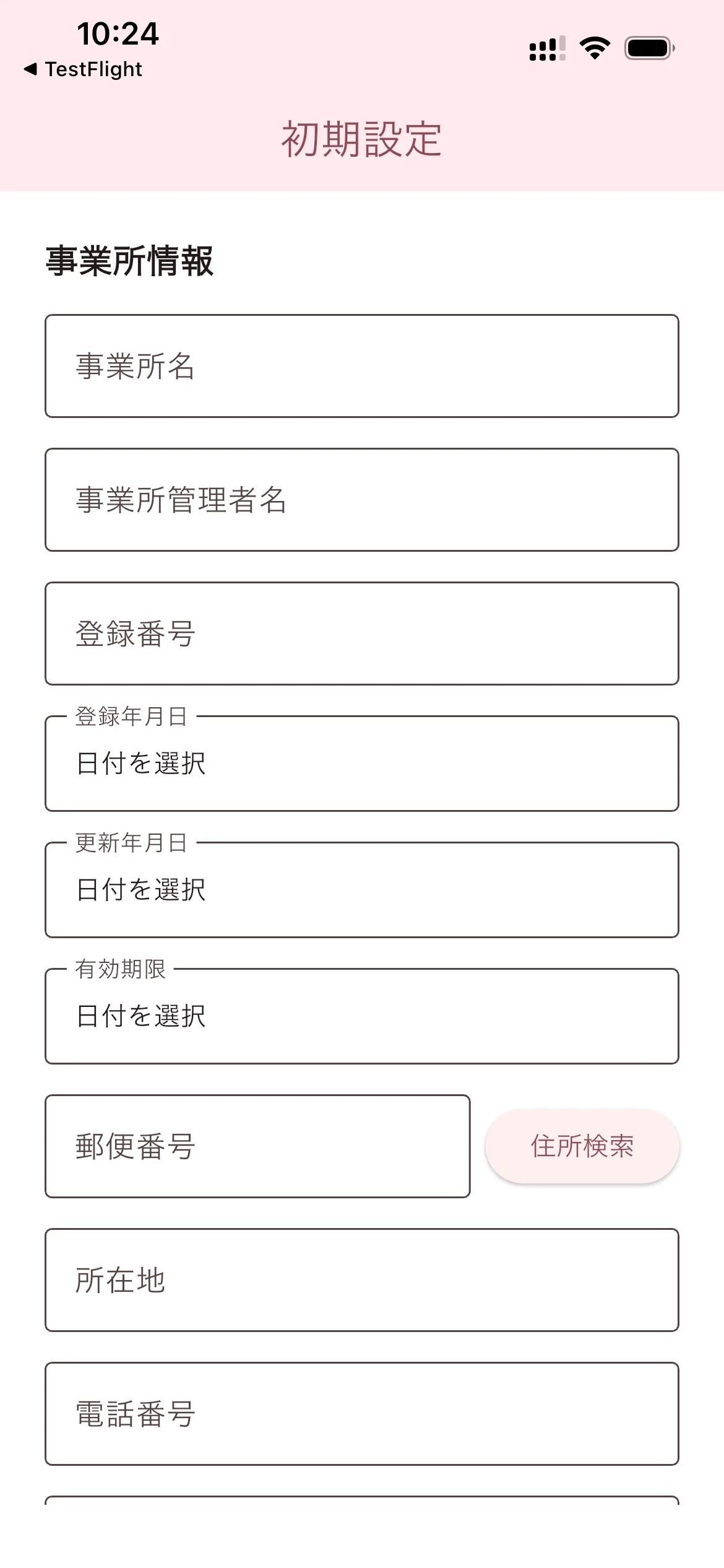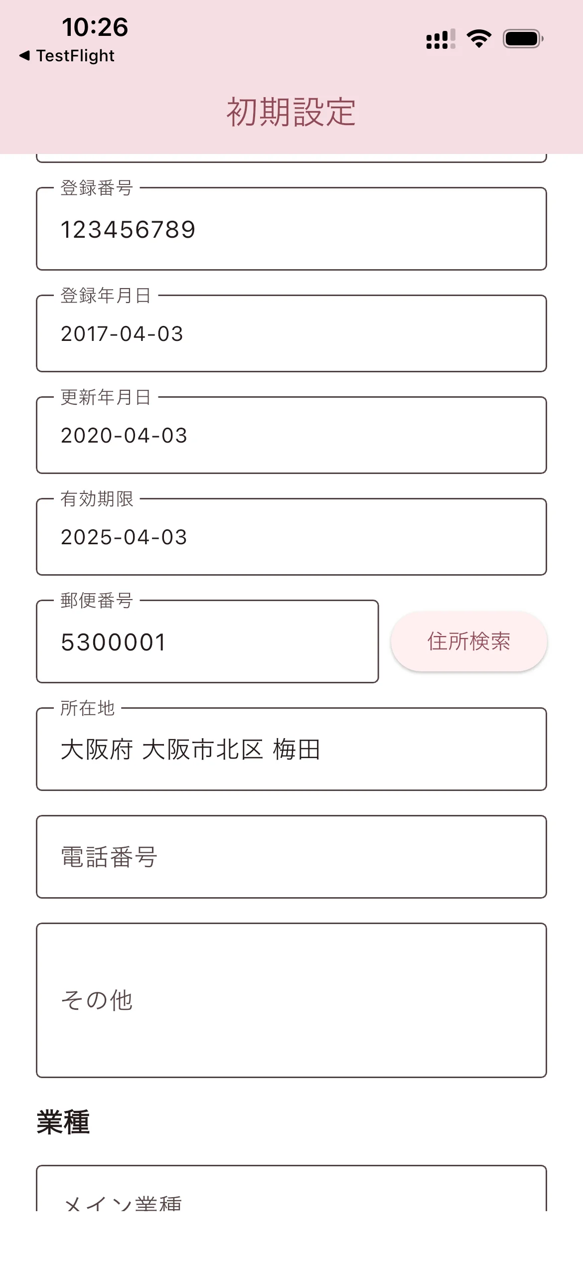 郵便番号を入力して「住所検索」をタップすると、所在地が自動的に入力されます。