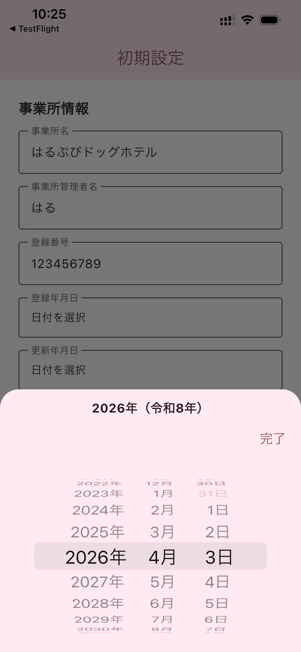 登録年月日 / 更新年月日 / 有効期限:それぞれタップするとカレンダーが表示されます。スクロールして日付を選び「完了」をタップしてください
