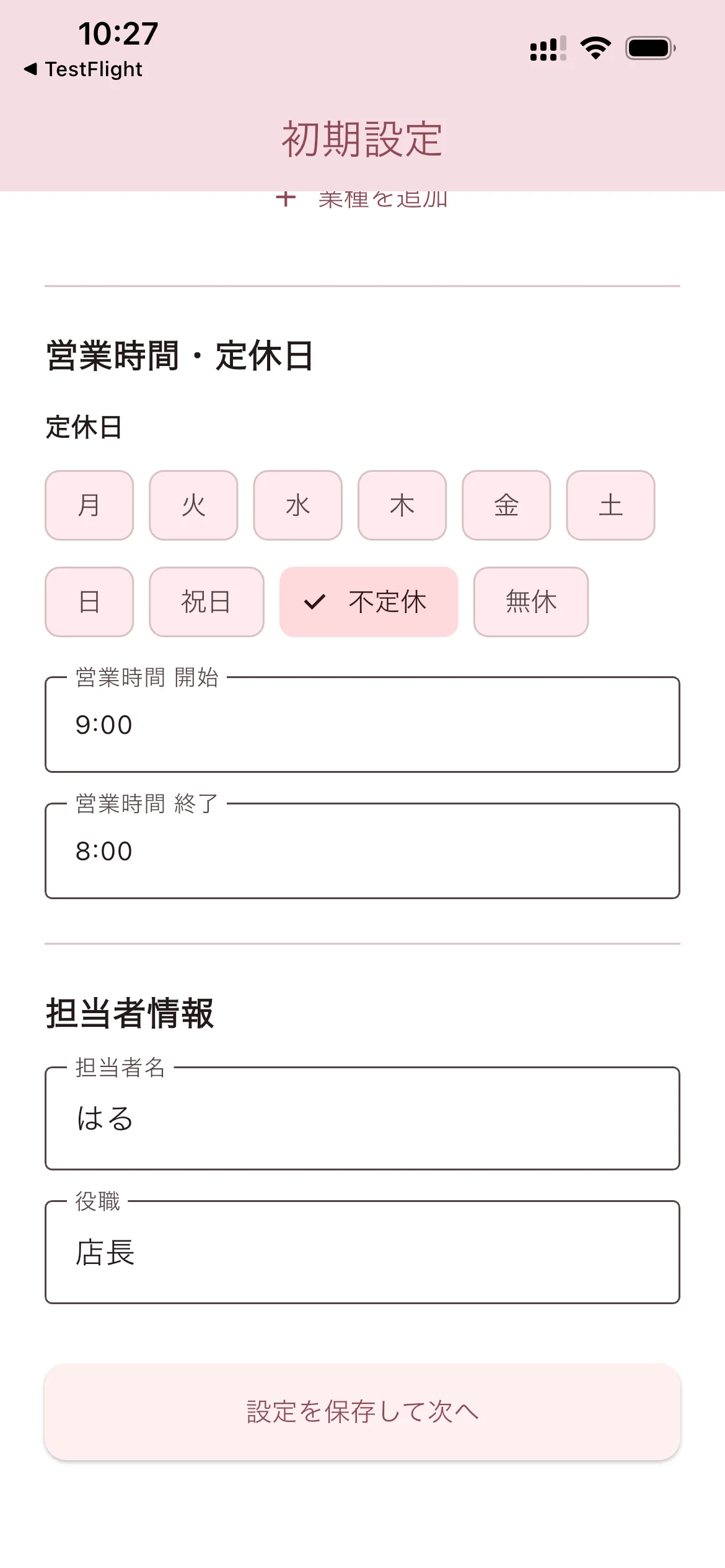 担当者名と役職を入力したら「設定を保存して次へ」をタップします。