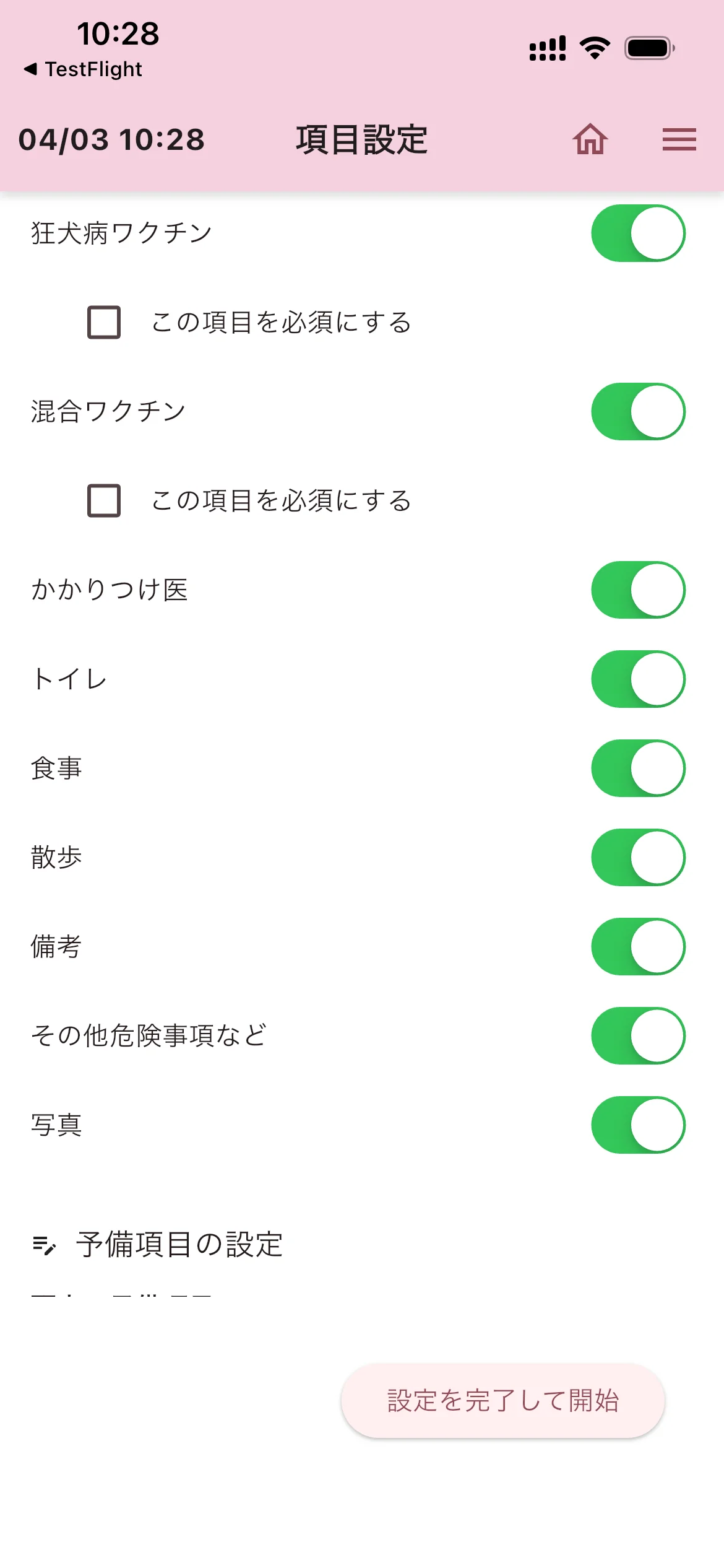 - 狂犬病ワクチン・混合ワクチン・かかりつけ医・食事・散歩など、必要な項目をONにしてください