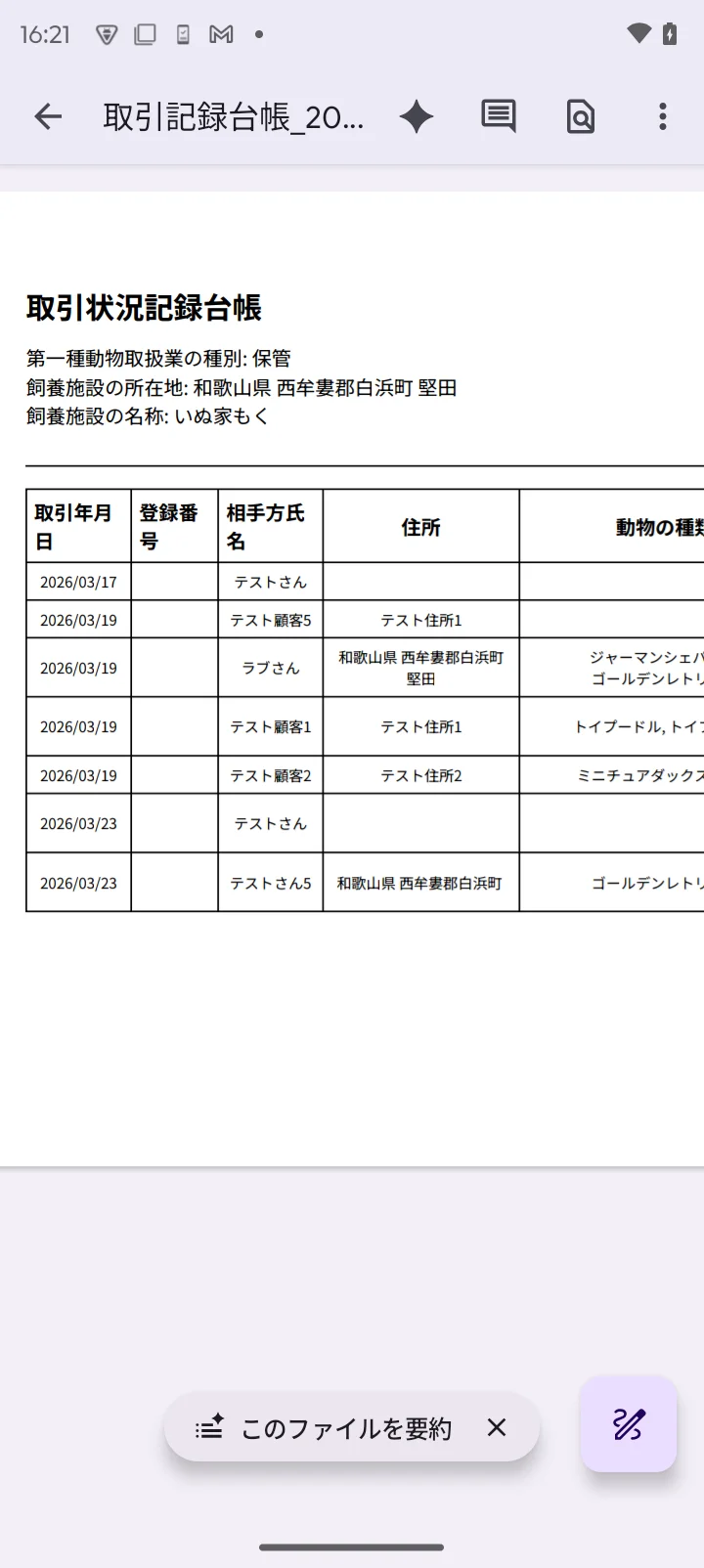 事業所情報・取引年月日・登録番号・相手方氏名・住所・動物の種類などが表形式で記録されます。この例ではPDFで出力されたものを表示しています。