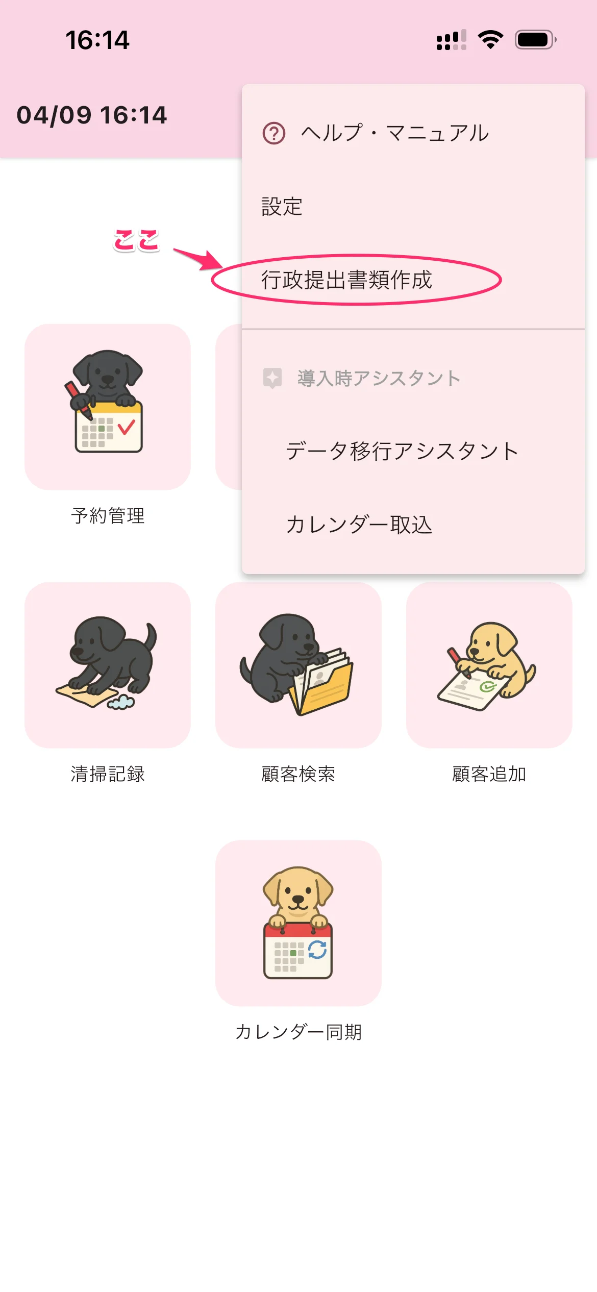 ホーム画面右上の ☰(三本線) をタップしてメニューを開き、「行政提出書類作成」をタップします。